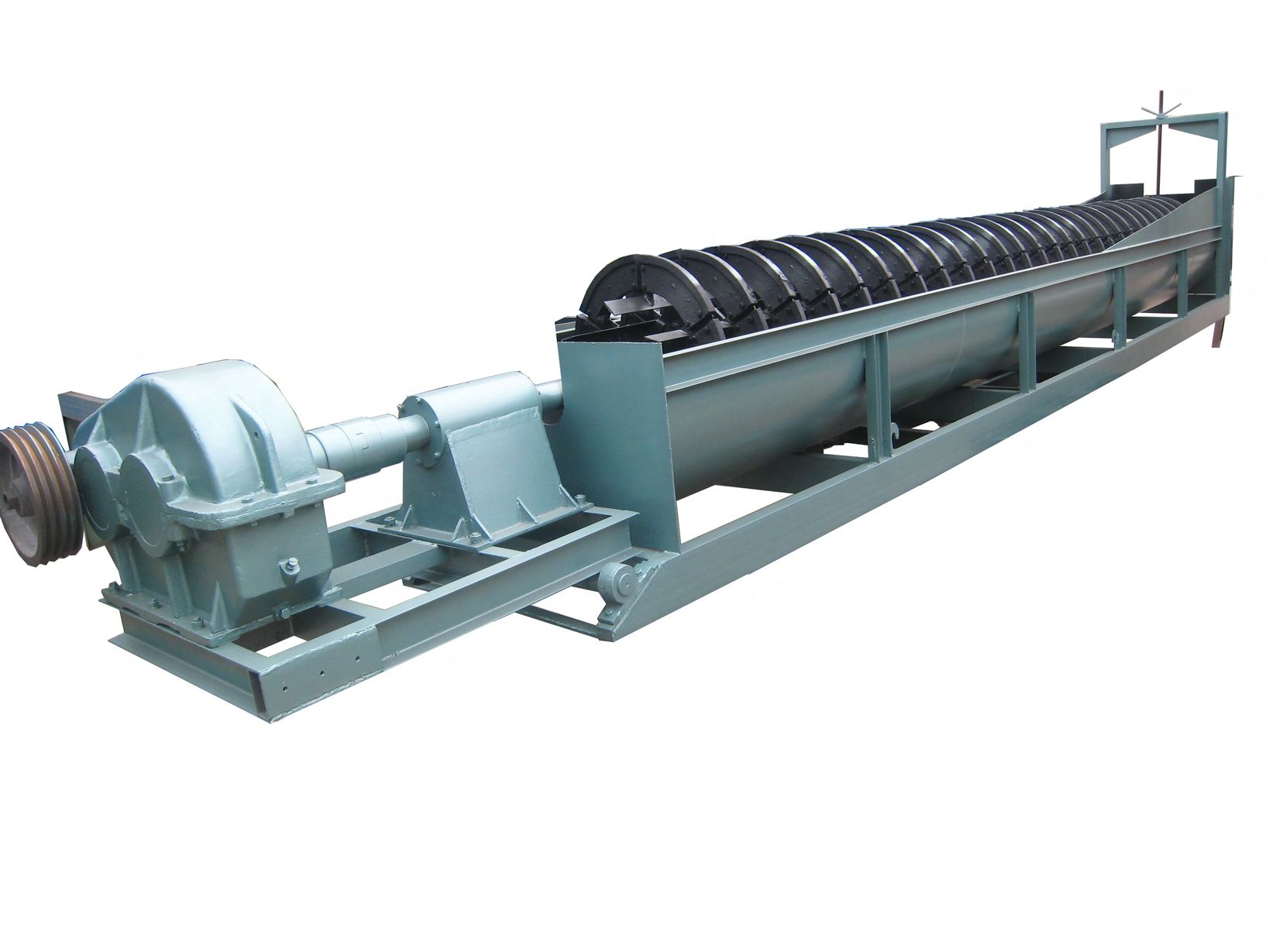 洗砂机工作时,电机通过三角带、减速机、齿轮减速后带动叶轮缓慢转动,砂石有给料槽进入洗槽中,在叶轮的带动下翻滚,并互相研磨,除去覆盖